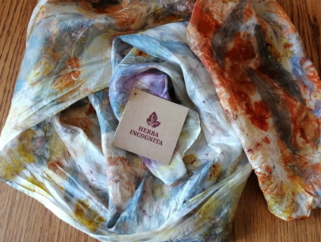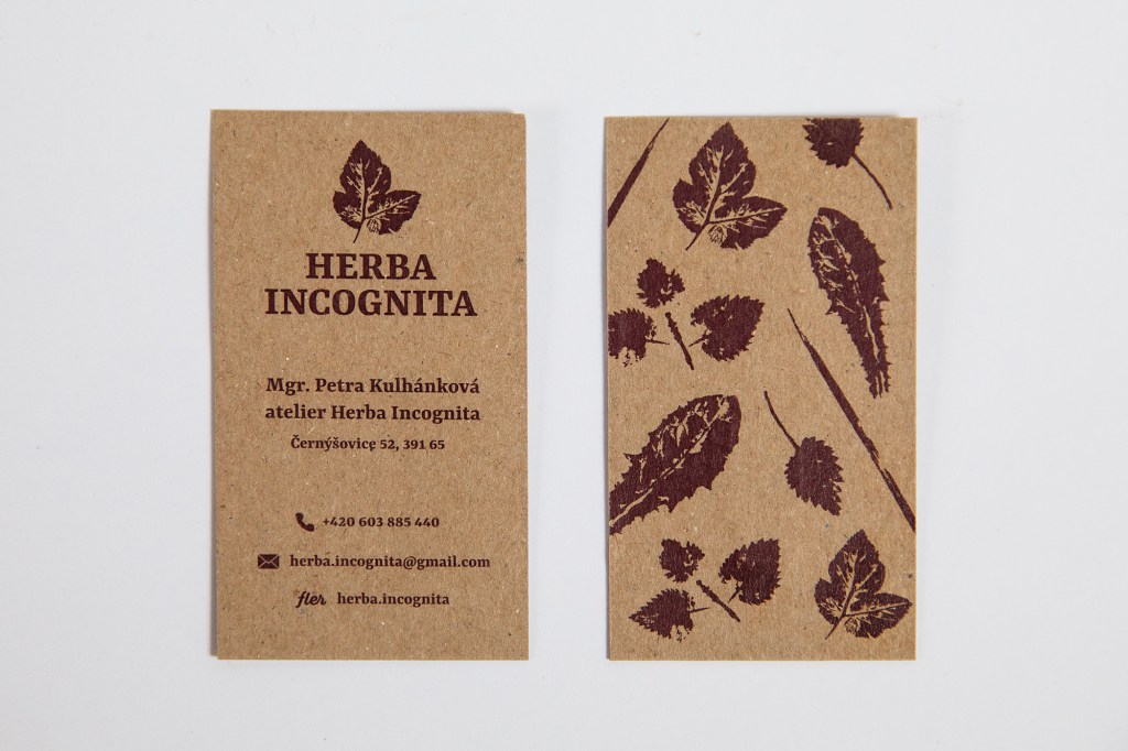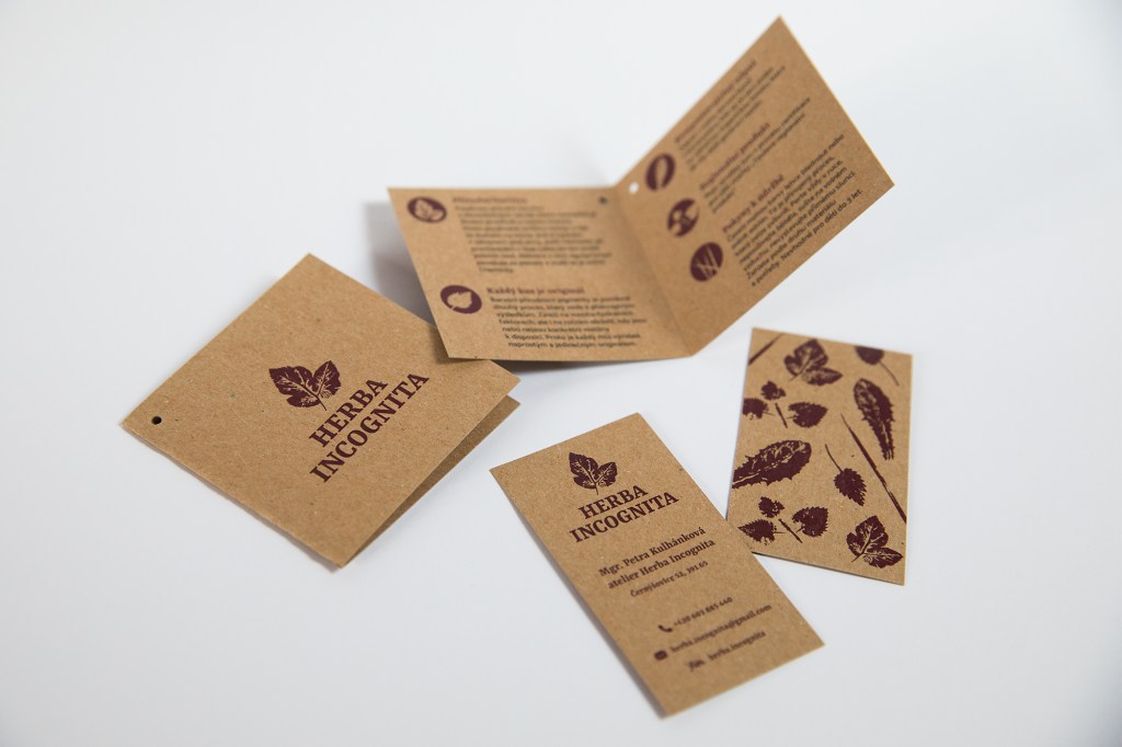 Návrh loga, vizitek a visaček na zboží pro značku Herba Incognita, která se zabývá barvením šátků přírodními barvivy.